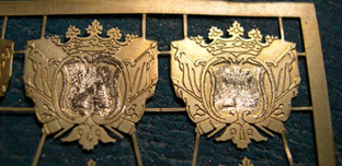 Esta misma técnica utilizaremos para retocar zonas del escudo central y del interior de los escudos pequeños. Utilizando negro en el caso de zonas con pintura más oscura que el marrón rojizo. |